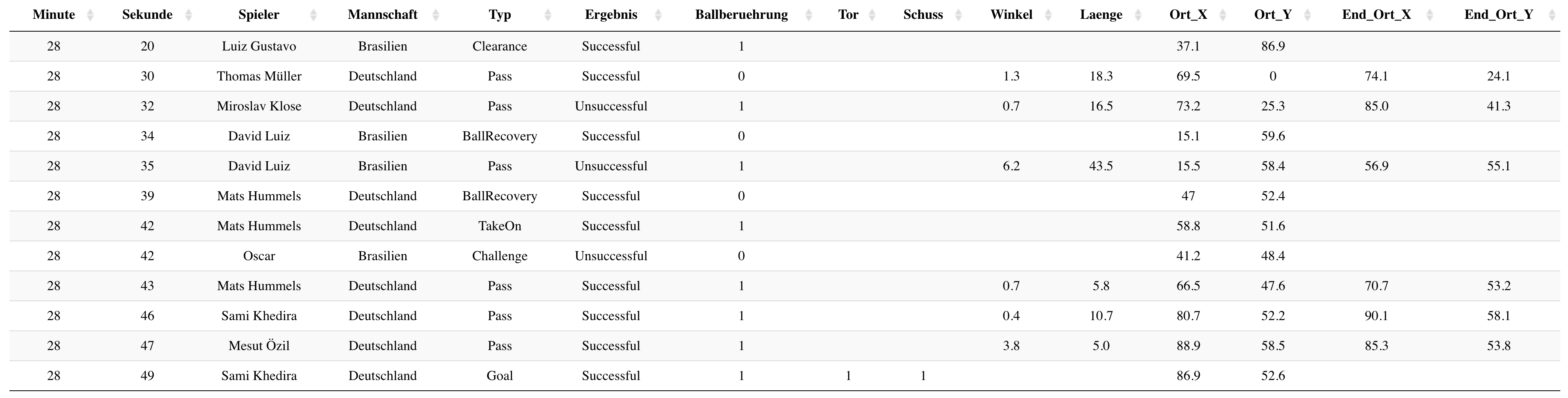 Eventdaten bilden das Grundgerüst auf dem obengenannte Statistiken beruhen und sind grundsätzlich einfach eine Tabelle mit allen Aktionen (Pässe, Schüsse, Zweikämpfe, gelbe Karten, Spielerwechsel, …) eines Fußballspiels. Je nach Provider haben diese Tabellen zwischen 2000 und 3000 Events/Reihen pro Spiel und nehmen circa 0.5 MB Speicherplatz ein.
