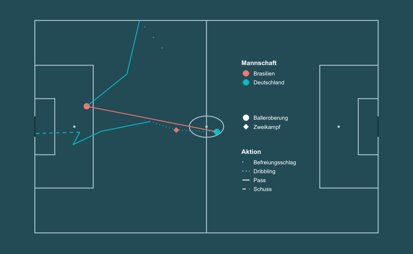 Was nun auffällt ist, dass Hummels’ Dribbling nicht in den Eventdaten enthalten ist. Wir müssen uns das durch die gegebenen Daten selbst erschließen. Auch fehlt uns die Information, dass der Schuss aus einer Spielszene resultiert in der Deutschland mit drei Spielern auf drei brasilianische Spieler zuläuft. Expected Goals-Modelle werden so wahrscheinlich die Erfolgschancen diese Schusses unterbewerten.