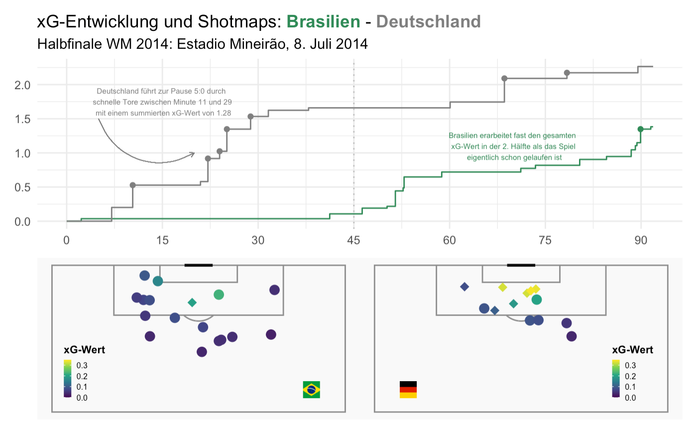 So sehen wir zum Beispiel auf einen Blick, dass das 3:0 Deutschlands einen relative kleinen xG-Wert hatte, also aus einer nicht-so-klaren Torchance entstand. Eine weitere interessante Periode ist die Viertelstunde nach der Pause, in der Brasilien einige Schüsse verzeichnete, aber den Ball nicht im Tor unterbringen konnte.