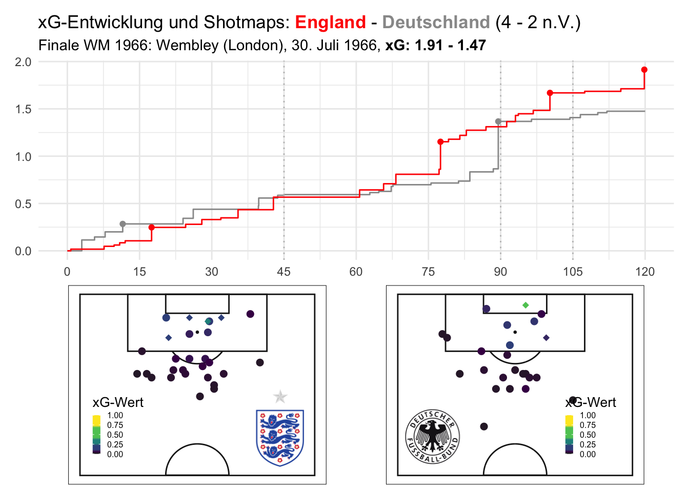 Doch auch dort bleibt England die bessere Mannschaft, bis in der 101. Minute das berühmte Wembleytor durch Geoff Hurst fällt. Deutschland schafft es nicht mehr gefährlich vors Tor und muss in der 120. Minute auch noch das 4:2 hinnehmen. England ist Weltmeister und nach xG auch verdient: 1.91 - 1.47