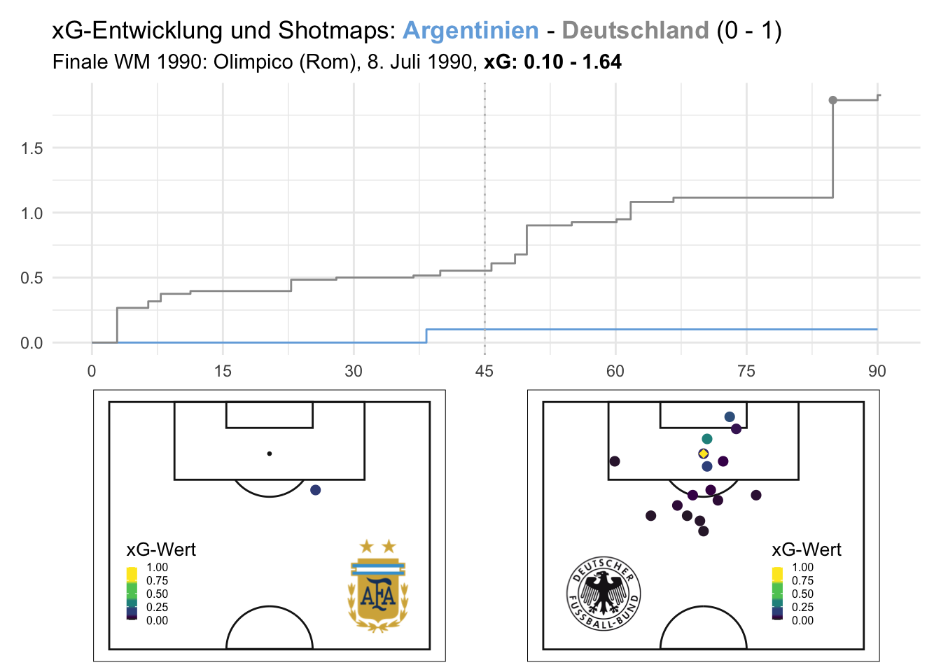 Expected Goals sind sicher ein interessanter Weg sich noch einmal mit historischen Partien zu befassen, deren Verlauf sich im Gedächtnis oft auf einzelne Ereignisse (zum Beispiel das Wembleytor oder Brehmes Elfmeter 1990) reduziert. Endspiele sind oft sehr knappe Begegnungen, in denen das Resultat und die eigentliche Qualität der Mannschaften voneinander abweichen können. Expected Goals können uns hier noch einmal einen anderen Blickwinkel verschaffen. Allerdings ist es immer wichtig die Schwächen der xG-Statistik in Erinnerung zu behalten.