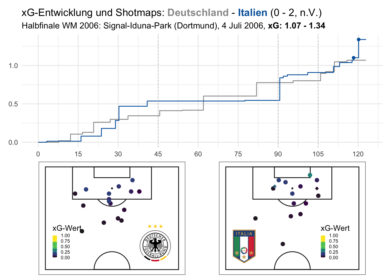 Es entwickelte sich eine offene Partie, die Podolski zweimal aus guter Position entscheiden hätte können ehe die Italiener mit einem Doppelschlag in der 119. und 121. Minute alles klar machen. Die xG-Entwicklung unterstreicht den Spielverlauf und Italien schafft sich erst in letzter Sekunde leichte Vorteile: 1.07 - 1.34