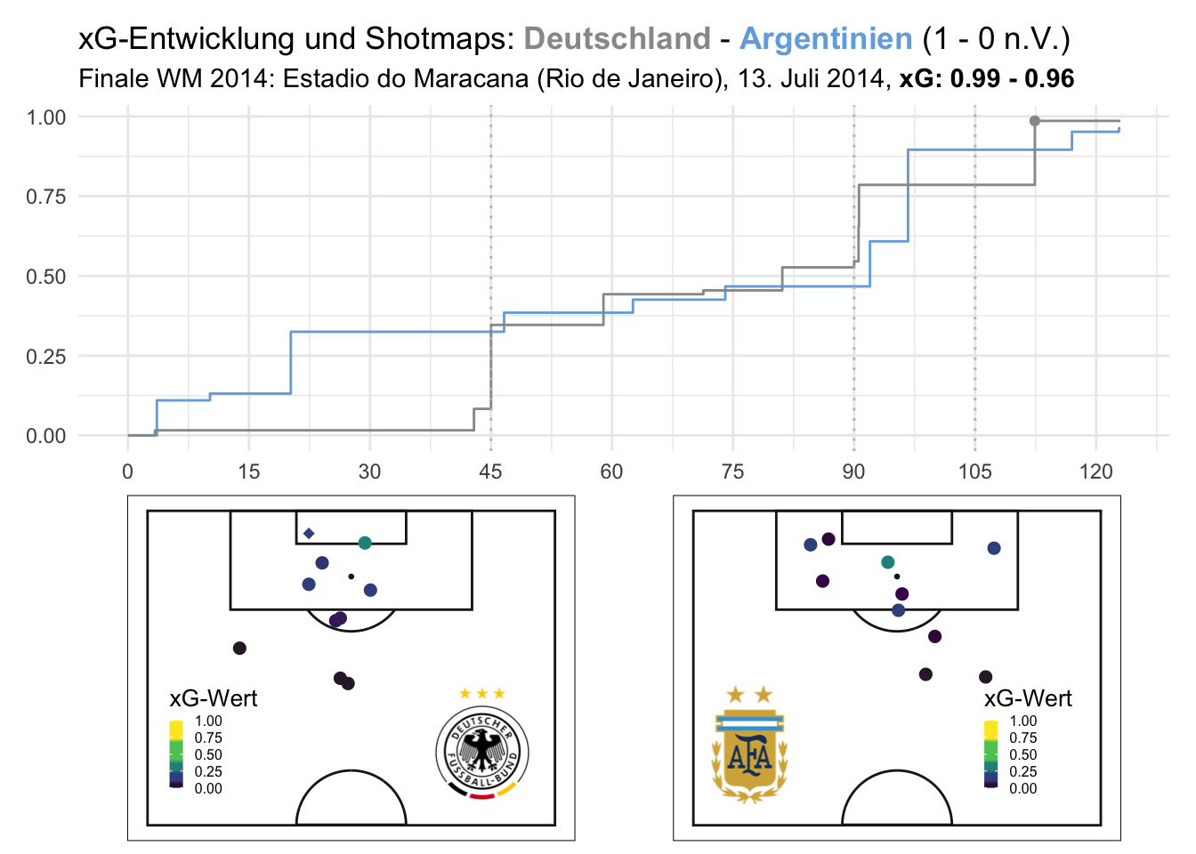 Die Verlängerung startet gleich mit einer tollen Chance für Andre Schürrle, die Argentinier kommen aber durch Unachtsamkeiten der Deutschen auch schnell zu zwei guten Chancen. Danach schaffen es die Südamerikaner immer weniger sich aus dem deutschen Powerplay zu befreien und Mario Götze belohnt den langen Atem der Deutschen mit seinem Siegtreffer in der 113. Minute. In Sachen xG war es wie zu erwarten einer ausgelichene Partie mit einer Bilanz von 0.99 - 0.96.