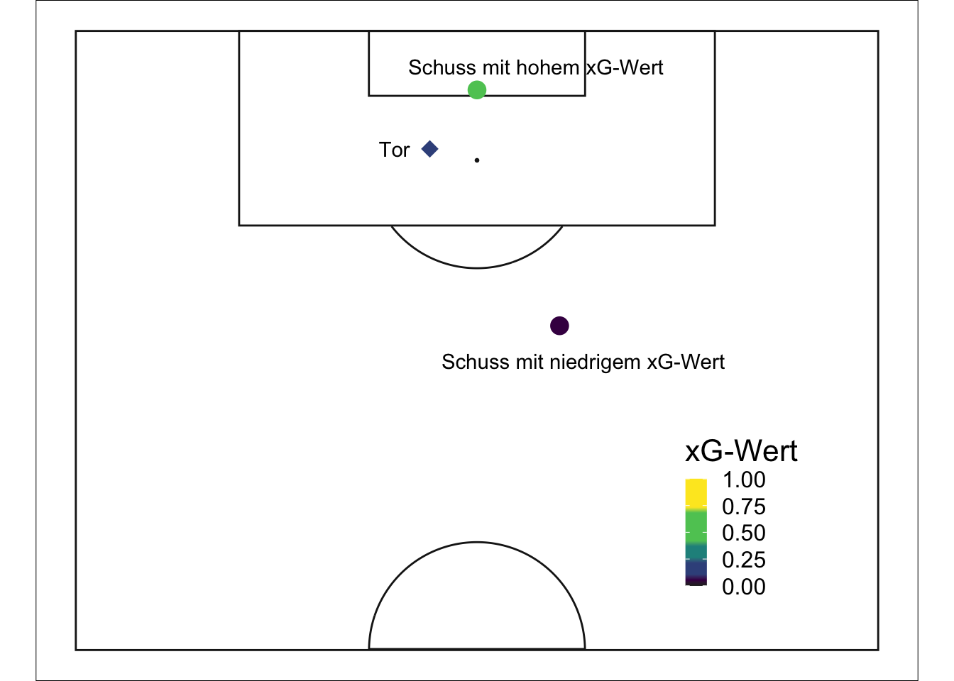 Shotmaps konzentrieren sich auf Schusspositionen und können Aufschluss über bevorzugte Schusslagen von Teams oder Spielern geben. xG-Werte und Resultate (gehalten, geblockt, Tor, …) können durch Farbe oder Form hervorgehoben werden. Im folgenden Beispiel wird die Qualität (xG) eines Schusses farblich hervorgehoben. Tore werden durch eine Raute dargestellt.