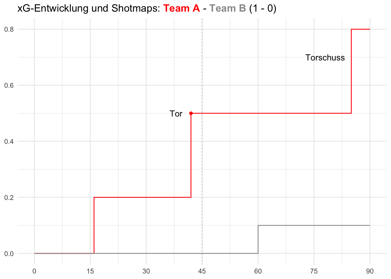xG-Timelines sind Darstellungen der kumulativen xG-Werte (y-Achse) beider Teams über die Dauer einer Partie (x-Achse). Jede vertikale Stufe entspricht einem Torschuss mit einem entsprechenden xG-Wert. Druckphasen der Teams lassen sich so besonders gut erkennen. Tore werden häufig nochmal durch eine weiteren Marker hervorgehoben.